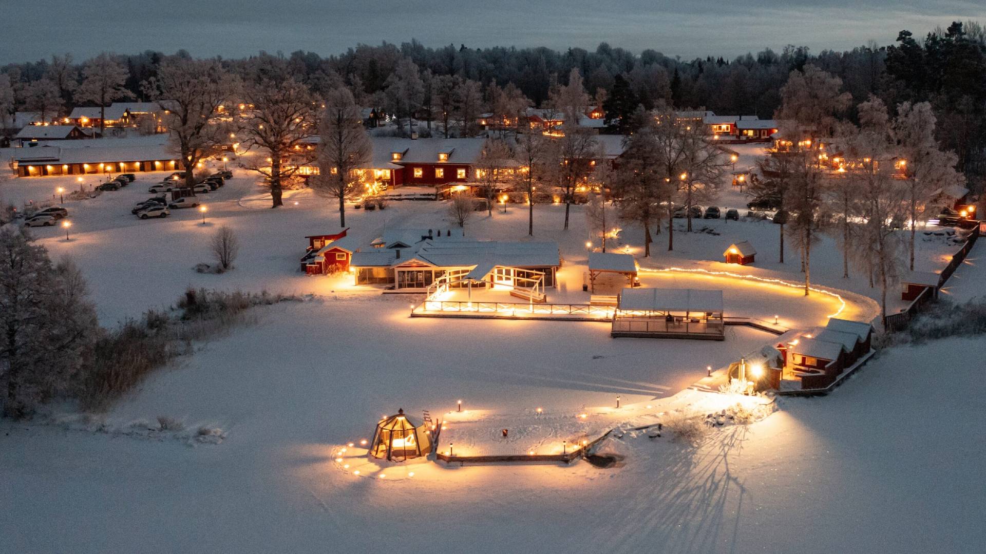 I vår glasigloo som ligger förtöjd vid vår egen brygga får ni vila i en mjuk dubbelsäng i värmen medan naturen och sjön utanför visar sig från sin allra bästa sida oavsett årstid.